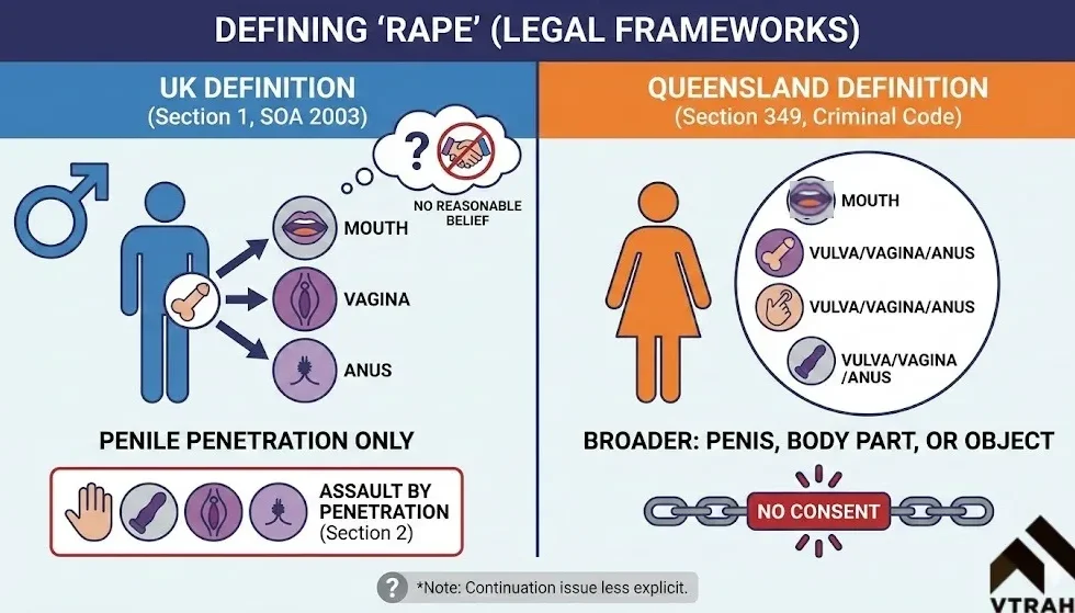 | Aspect | UK (Sexual Offences Act 2003) | Queensland (Criminal Code 1899) |