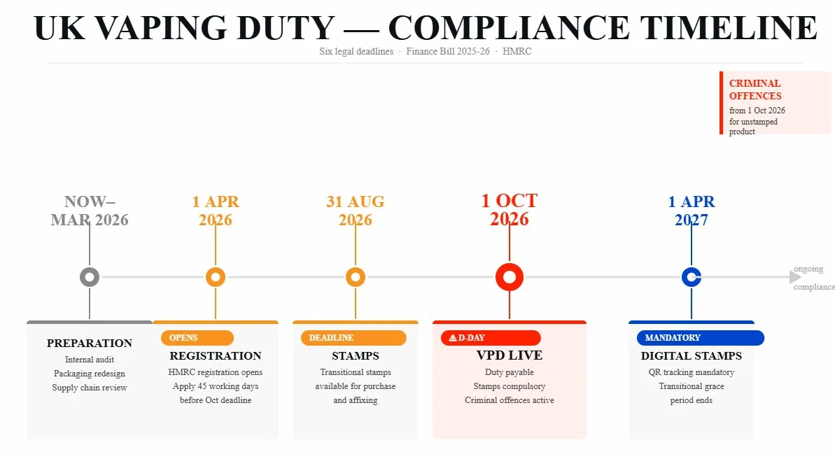 • 1 October 2026: VPD takes effect. Duty payable on all products released for consumption. Stamps compulsory on retail packaging. Criminal offences and civil penalties enforceable.