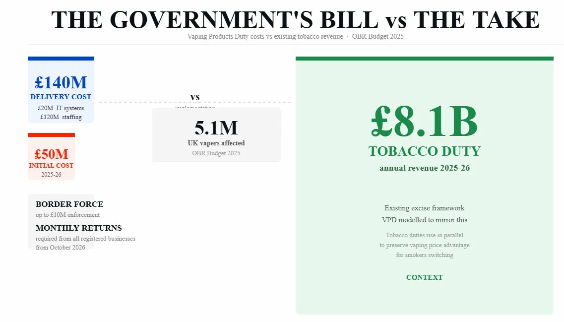 • The Vaping Products Duty (VPD) takes effect on 1 October 2026, marking the first time e-liquids have carried excise duty in the UK.